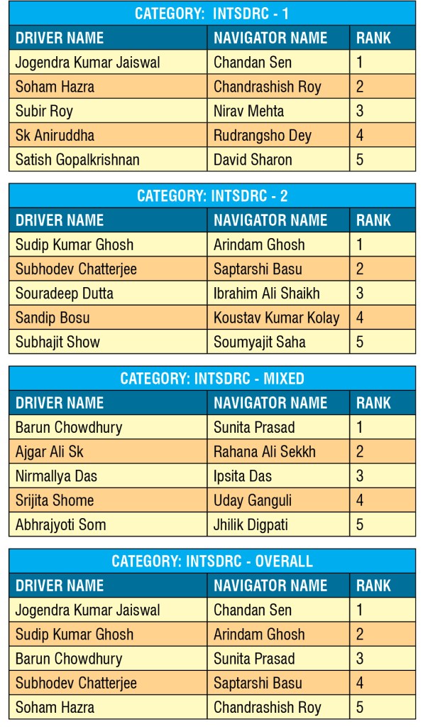 The team of Sudip Kumar Ghosh and Arindam Ghosh secured the first position in INTSDRC-2 category, finishing second overall with 39 penalty points. The team of Subhodev Chatterjee and navigator Saptarshi Basu finished second followed by the pair of Souradeep Dutta and co-driver Ibrahim Ali Shaikh taking the third step on the podium in the INTSDRC-2 category.